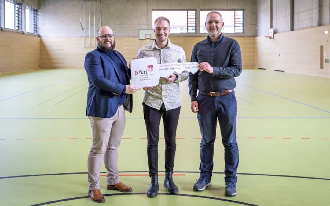 Foto: (v.l.) Arne Ott, Schulleiter Christopher Armstroff, Matthias Bärwolff/Stadtverwaltung Erfurt