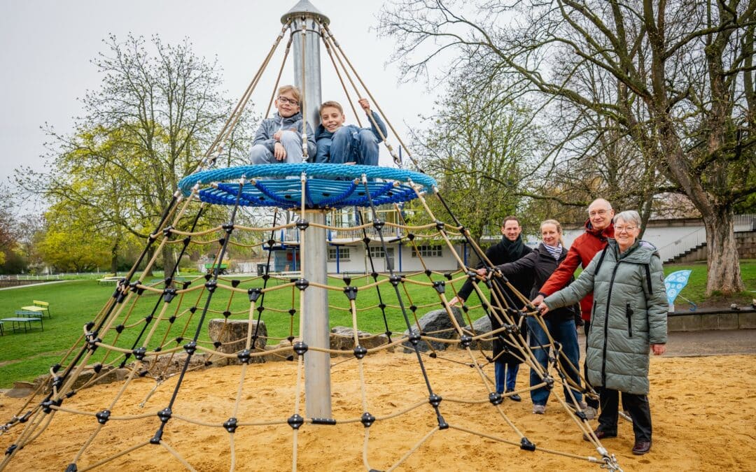 Auf die Plätze, fertig, klettern! Die vierte und letzte der erneuerten Seilpyramide auf dem egapark-Spielplatz wurde am 14. April 2026 offiziell eingeweiht. Im Jahr des 65-jährigen Bestehens des egaparks konnte die 2024 begonnene Sanierung der vier Spielgeräte damit abgeschlossen werden. Zur Einweihung waren auch Unterstützer der erfolgreichen Spendenaktion auf der Erfurt-Crowd eingeladen. 25.038 Euro an Spenden kamen auf der Plattform von 204 Unterstützern zusammen. Damit konnte auch die vierte Seilpyramide mit ihrem Charme und ihrer Geschichte im alten „Look“ erneuert werden. „Die neuen Seilpyramiden werden auch in Zukunft ein Ort sein, der Kinder zum Klettern und Entdecken einlädt. Diese spannende Erfahrung teilen viele Kinder mit ihren Eltern, die in ihrer Kindheit ebenfalls hier Mut und Geschicklichkeit bewiesen haben. Solche gemeinsamen Erlebnisse verbinden und es war deshalb für viele auch ein emotionaler Schritt zu spenden. Wir sind sehr froh darüber, dass wir durch das Crowdprojekt den kompletten Seilzirkus erneuern konnten“, erklärt Bettina Franke, egapark-Geschäftsführerin.