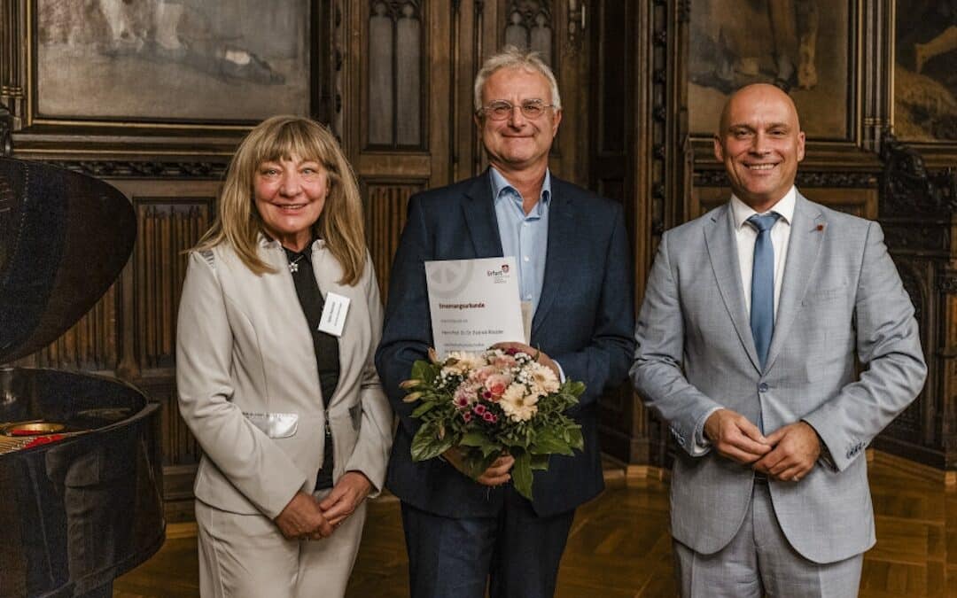 Foto: (v.l.) Hochschulbeauftragte Sylke Osterloh, Prof. Dr. Dr. Patrick Rössler, Andreas Horn/Stadtverwaltung Erfurt